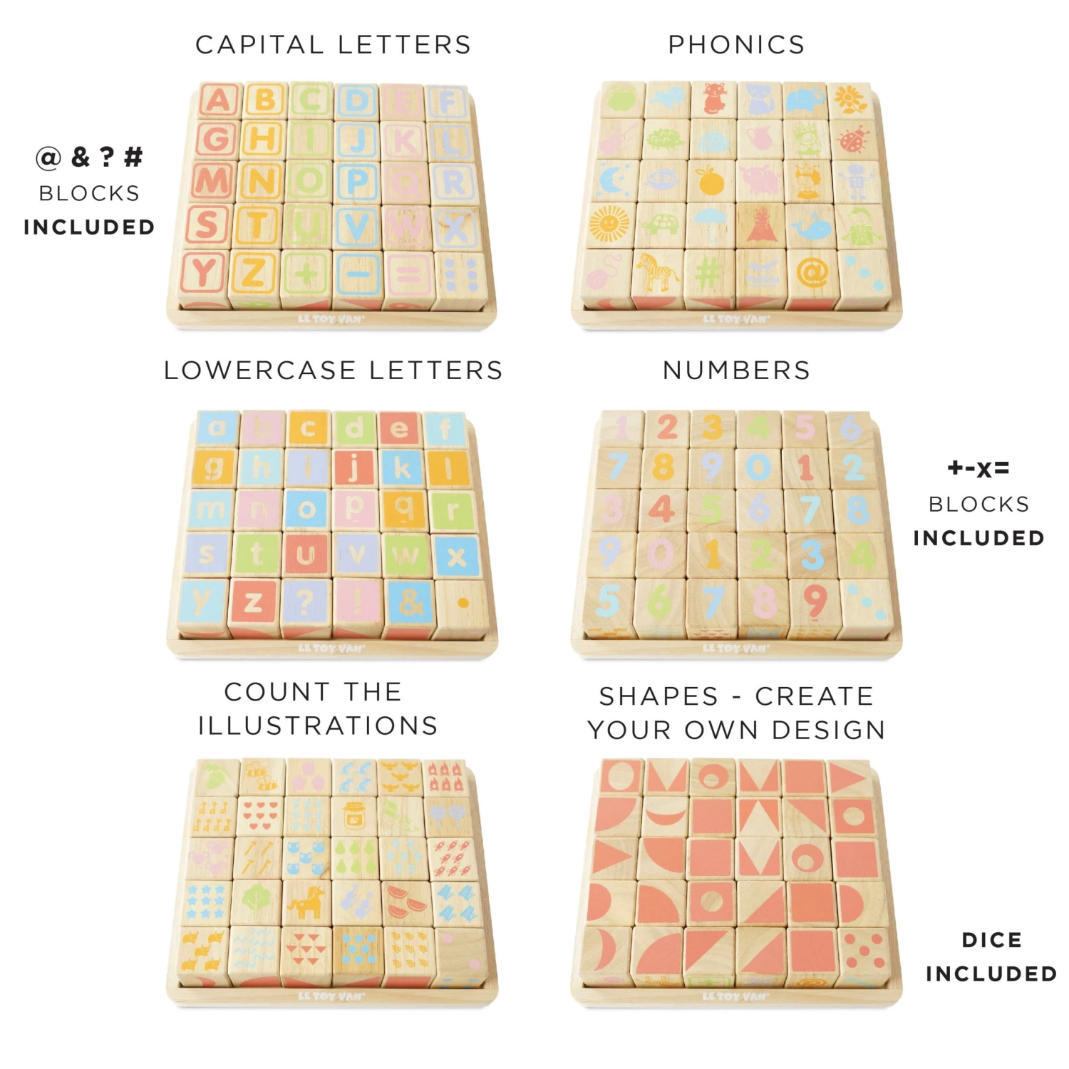 Each face is beautifully hand screen printed, making each one unique, and features a different design with numbers and letters to discover as well as illustrations of objects and animals.