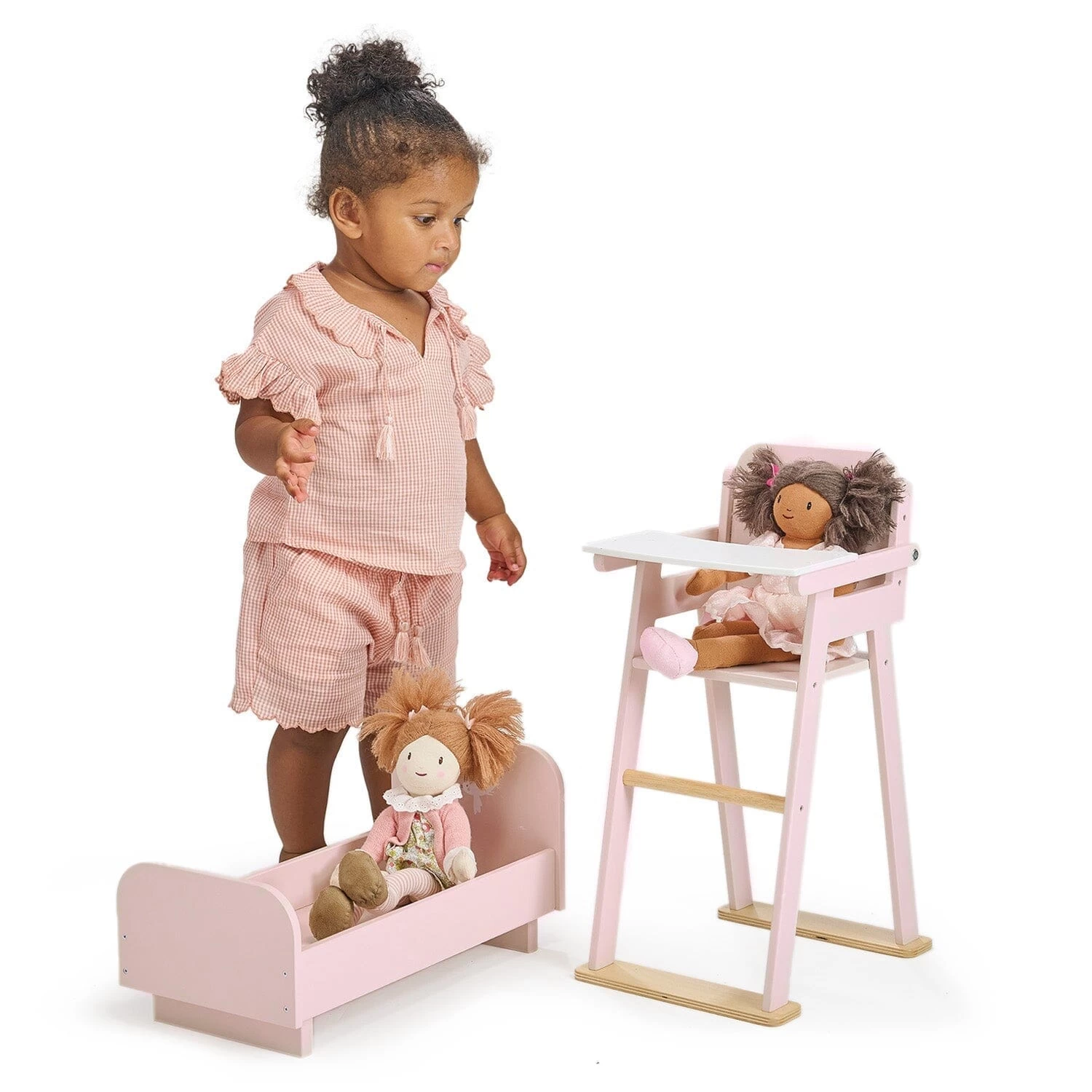 Accompanying the wooden crib is the pink Baby Doll High Chair, which boasts a matching lovely bird illustration on the backrest, infusing mealtime with whimsy. The high chair’s table is ingeniously designed to flip up and down, making it easy for little hands to manage feeding sessions. Our wooden high chair is perfect for teaching routines and encouraging role-play that mirrors the care and attention of real-life parenting.