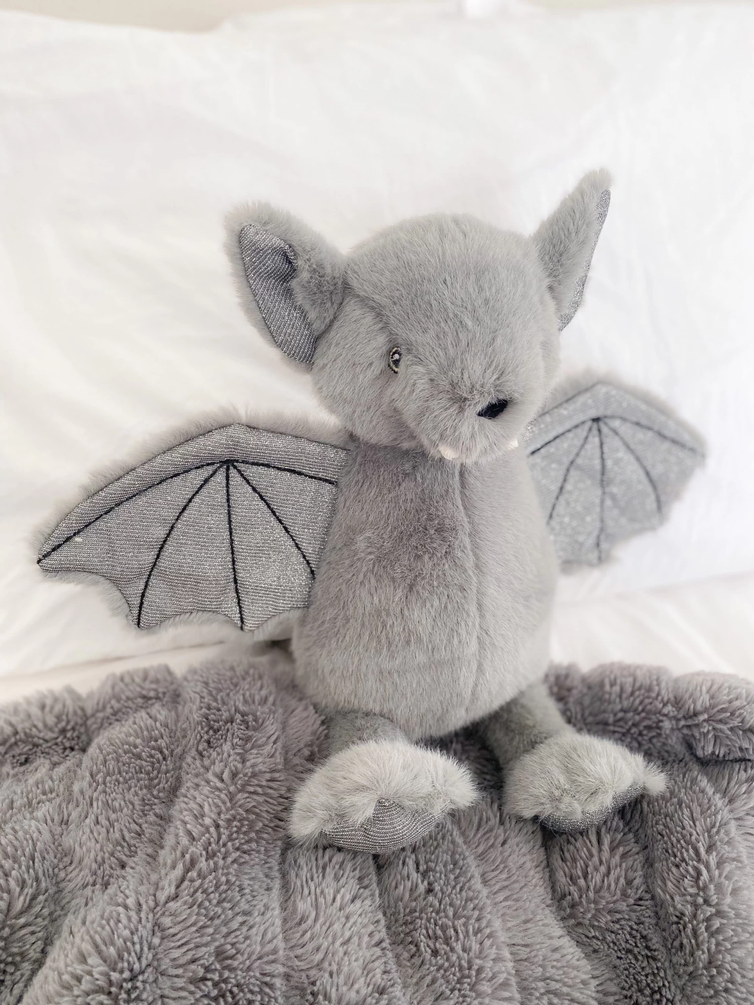 Too cute to spook…meet Bellamy the Bat! Bellamy loves to swoop or just ‘hang around’ in his beautiful gray fur a lux silver wings.