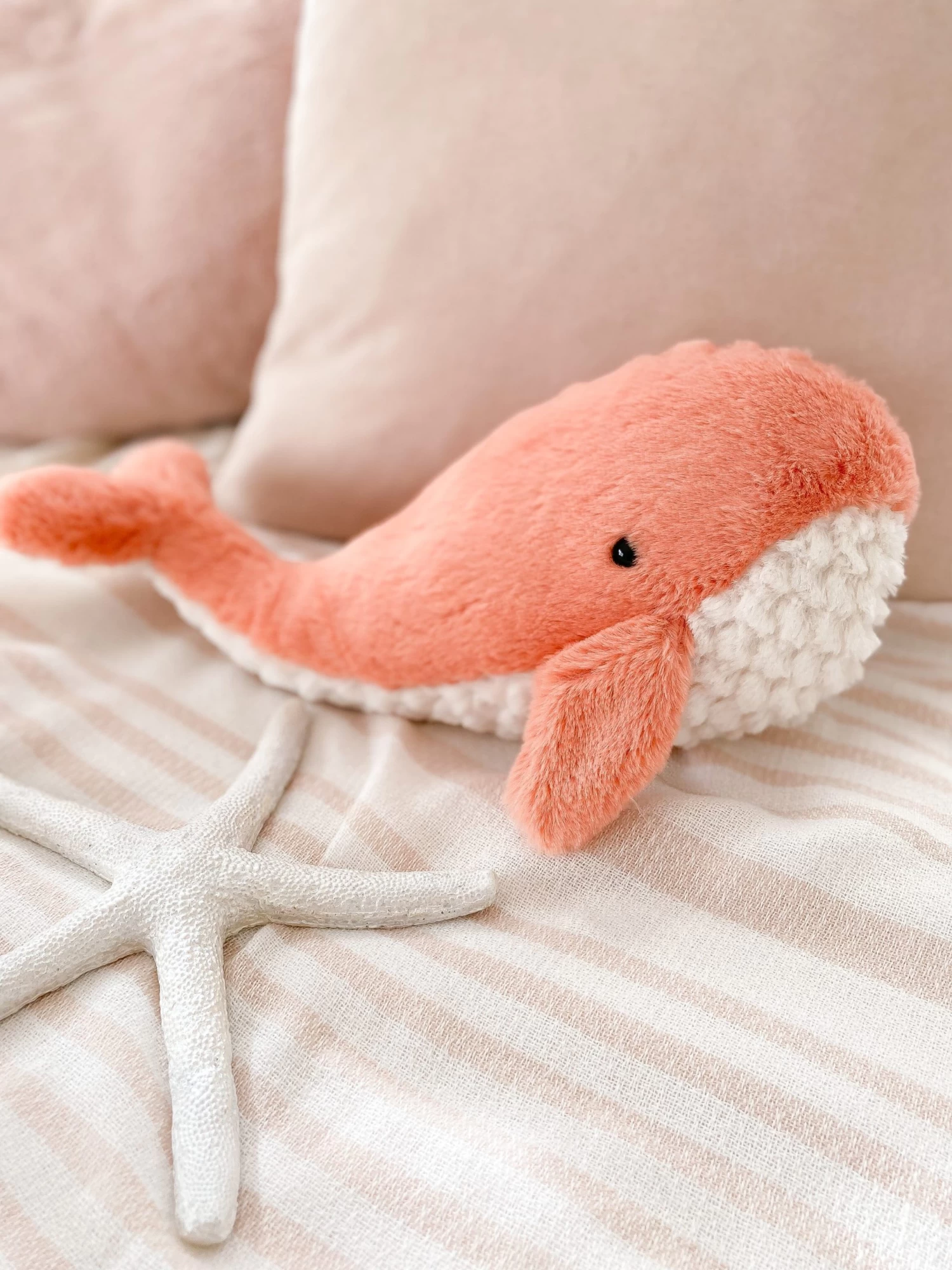 Coral Whale is a super soft plush in beautiful coral color with underbelly in novel ribbed chenille fabric. Will delight all whale watchers!