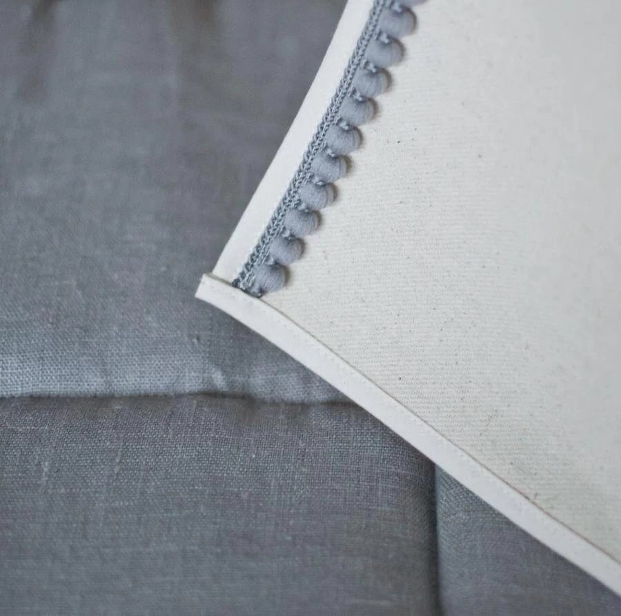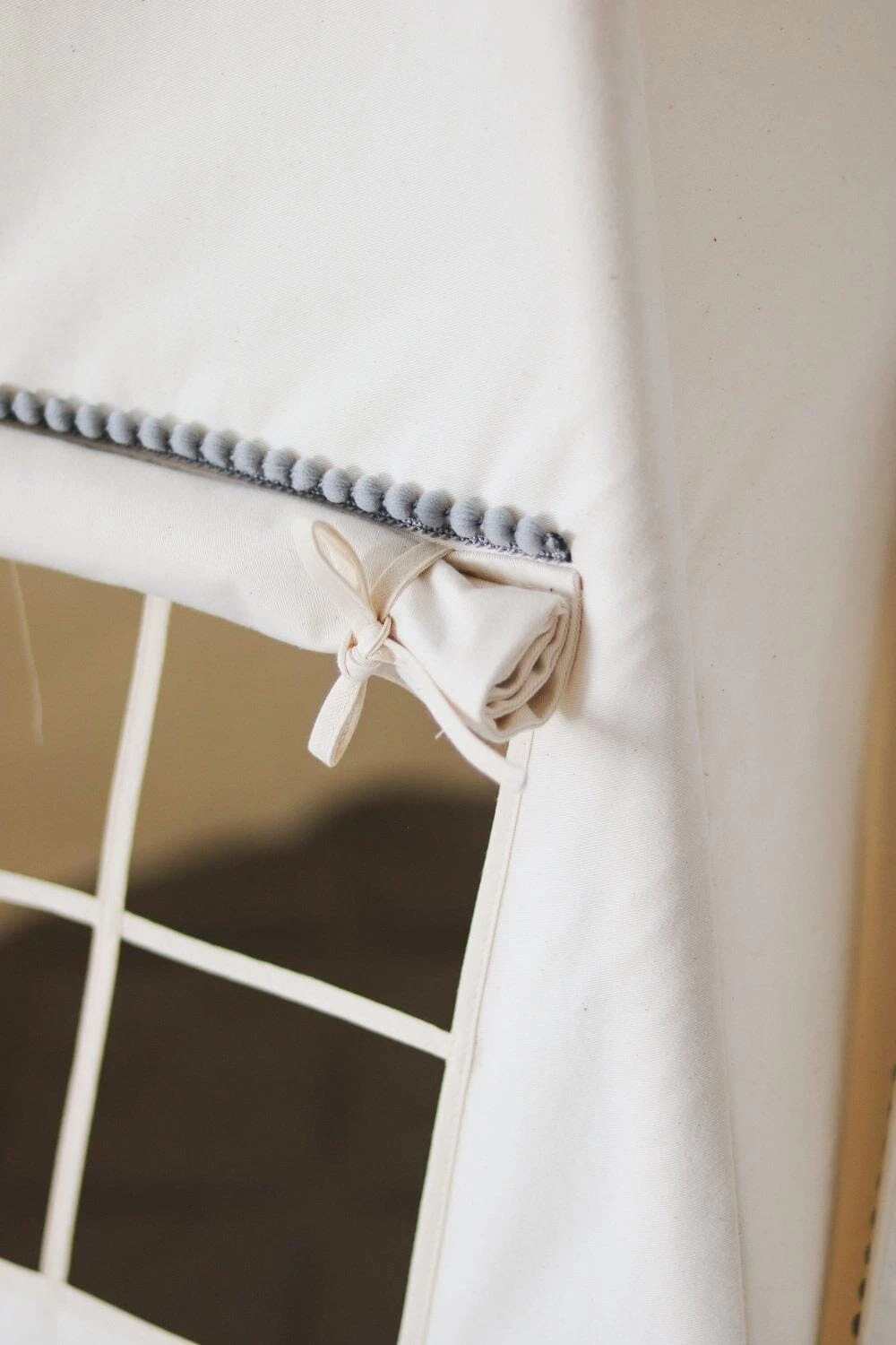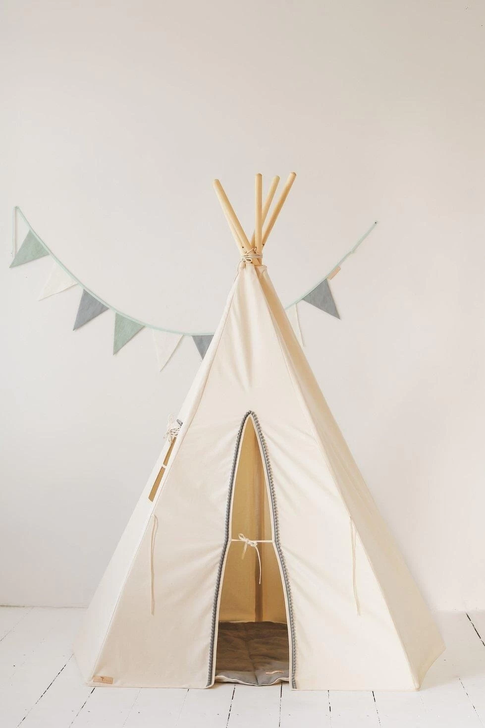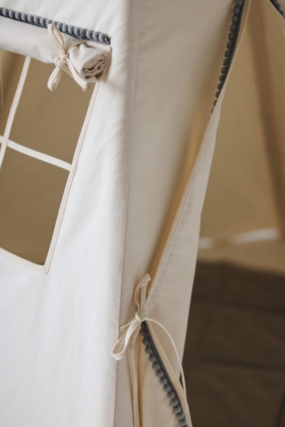 The “Grey Pompoms” Teepee Tent is firmly sewn from thick cotton fabric and adorned with grey pompoms around its edges.
