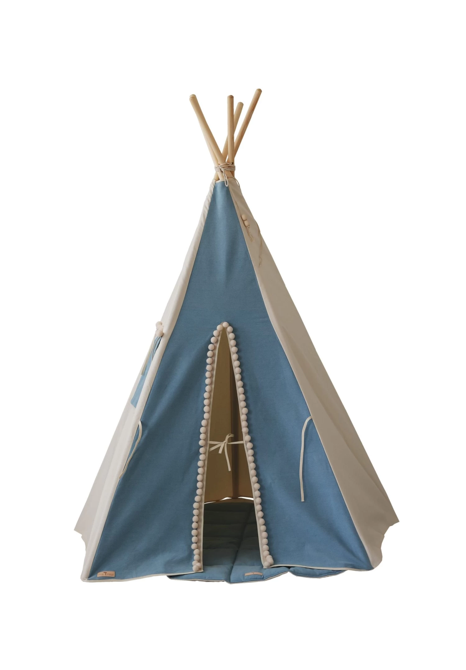 The “Jeans” Teepee Tent is firmly sewn from strong cotton fabric and adorned with fluffy pompoms around its openings.