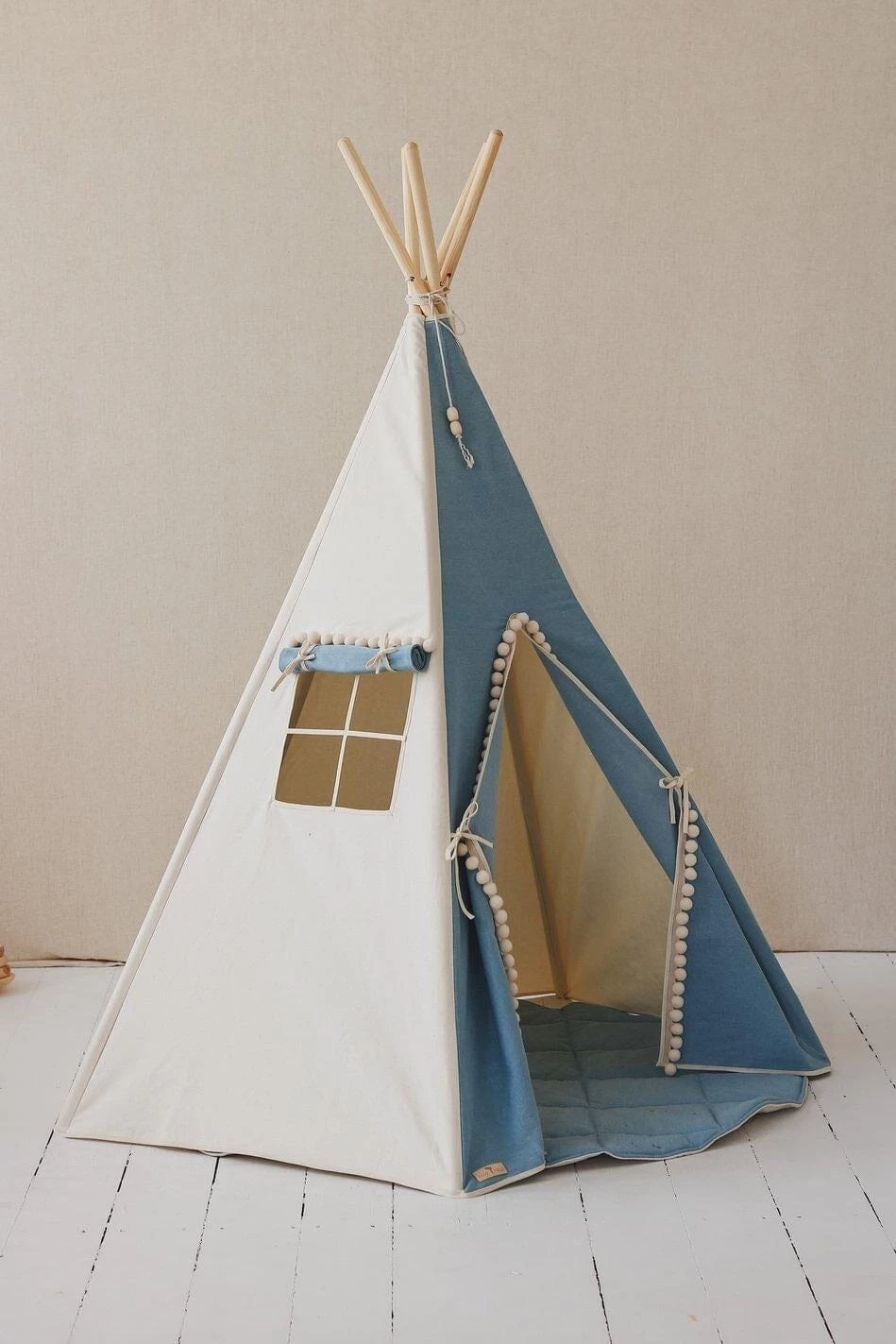 The “Jeans” Teepee Tent is firmly sewn of strong cotton and denim fabric and adorned with large white pompoms around its openings.