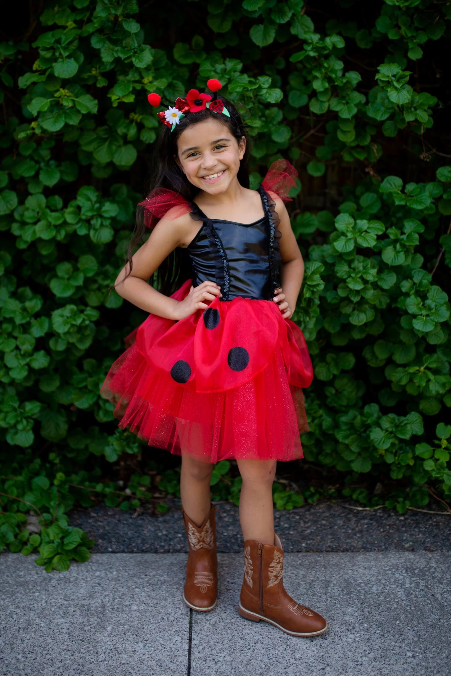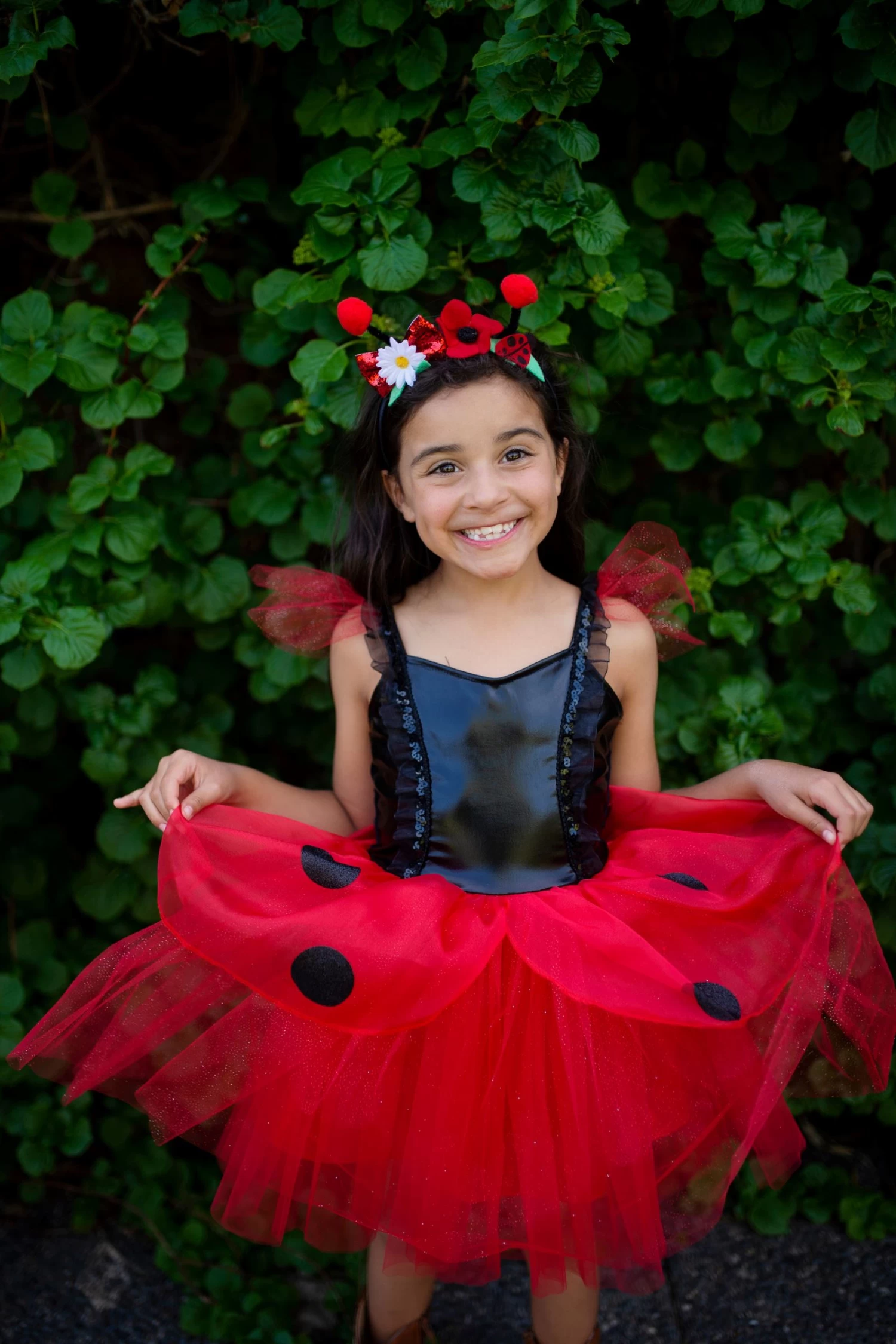 Little ladybugs are sure to fall in love with our new Ladybug Dress & Headband Set. The dress features a black bodice with a red jewel accent and a red tulle skirt with black spots. Also included in the set is a ladybug headband with pom antennae and garden-inspired designs. Pair it with our Ladybug Wings & Headband for a garden-ready look.