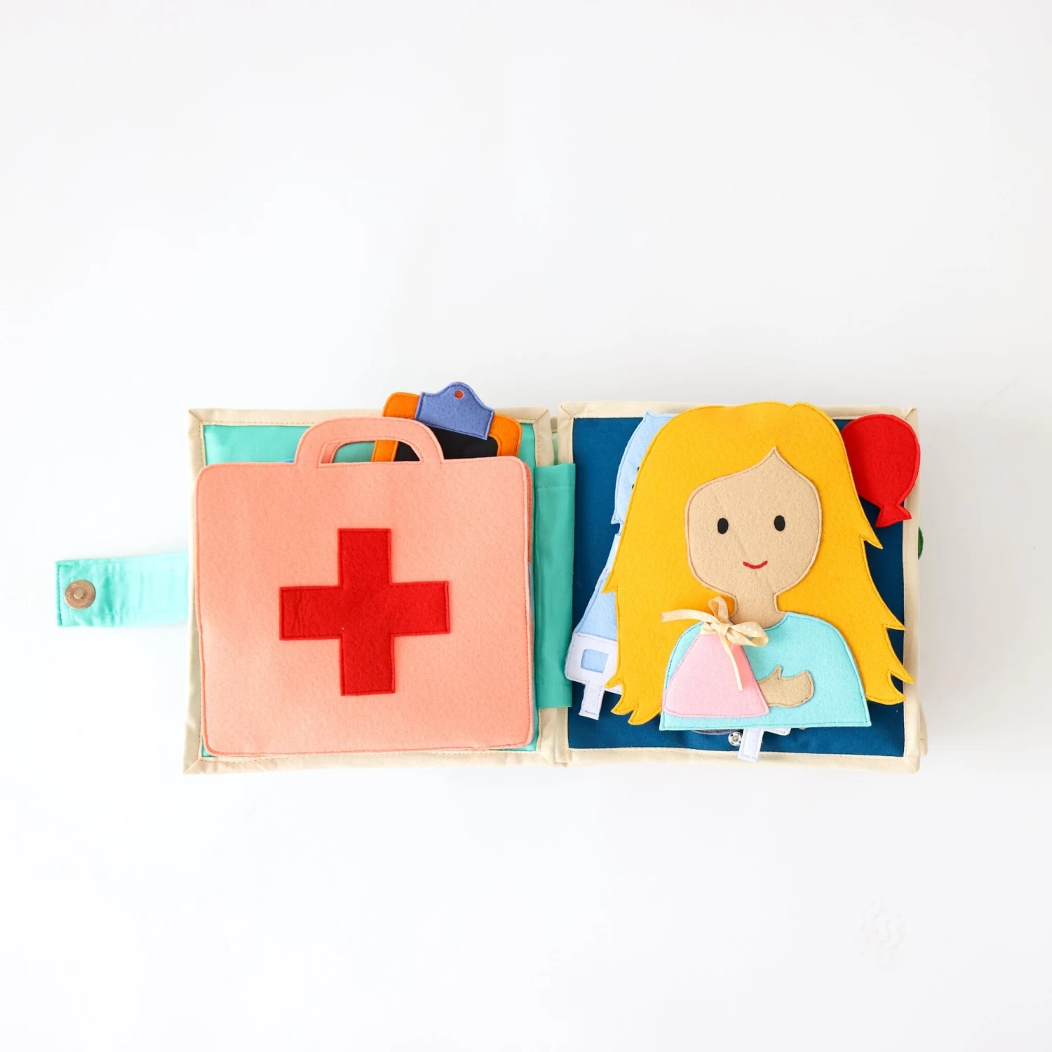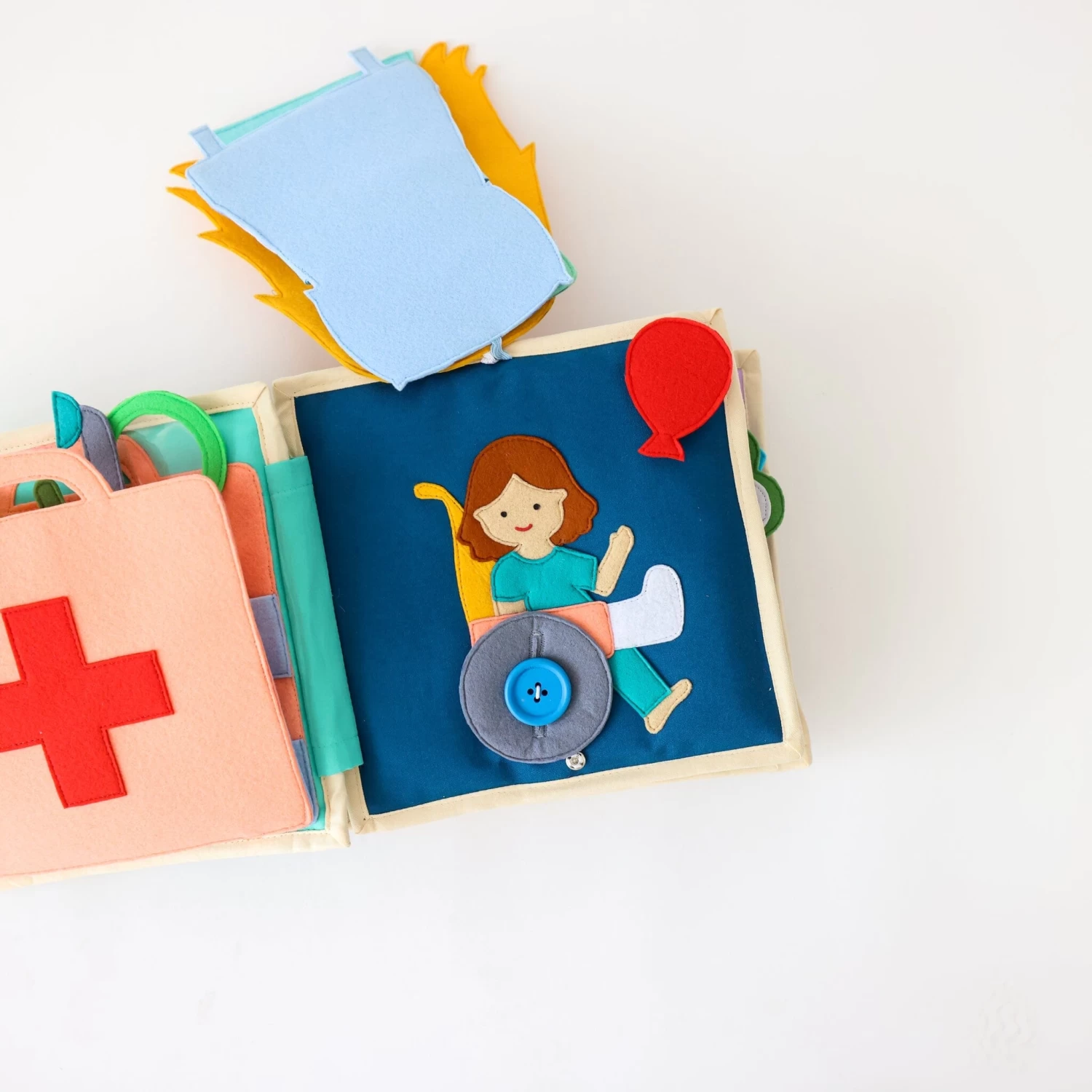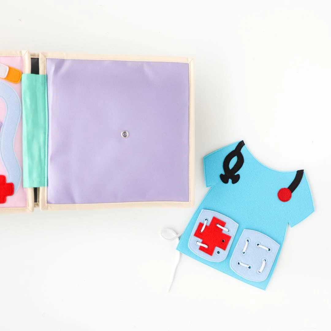 Introducing our Medical Adventure quiet book – a captivating and interactive playset designed to ignite your child’s imagination! This book features a removable medic doll and a full doctor’s kit for endless role-playing fun. With nesting patients adorned with buckles, buttons, and tying elements, your child will develop fine motor skills while caring for their adorable patients. The vet section includes an X-Ray machine, crate, and removable cat and dog companions. Food puzzles and threadable scrubs add educational value to the book. Order your Medical Adventure quiet book today and let the imaginative medical journey begin!