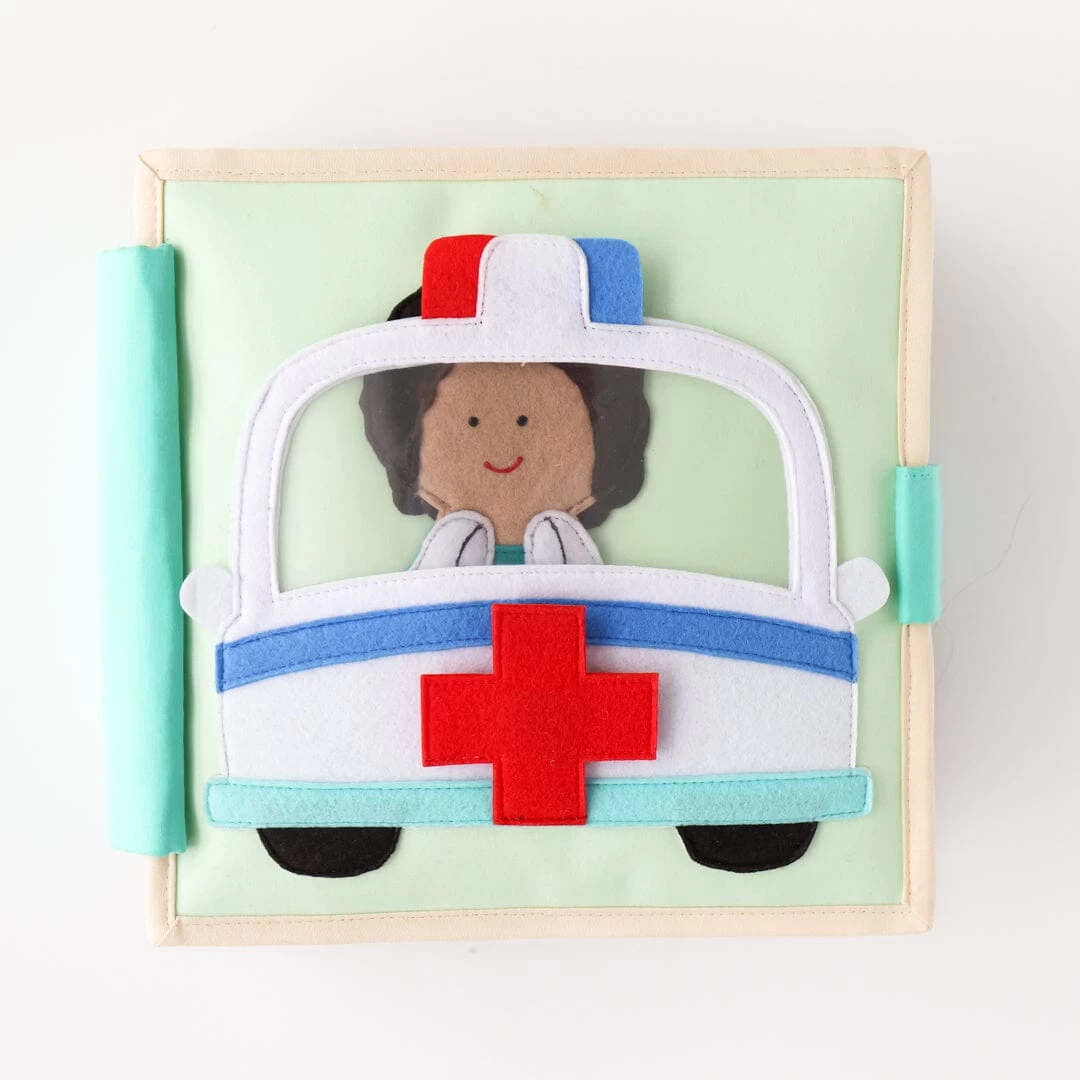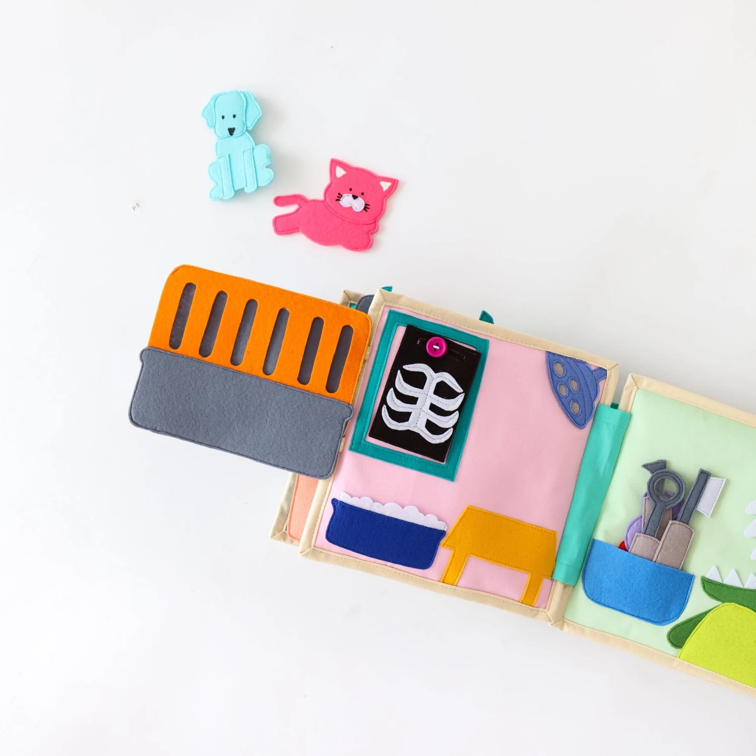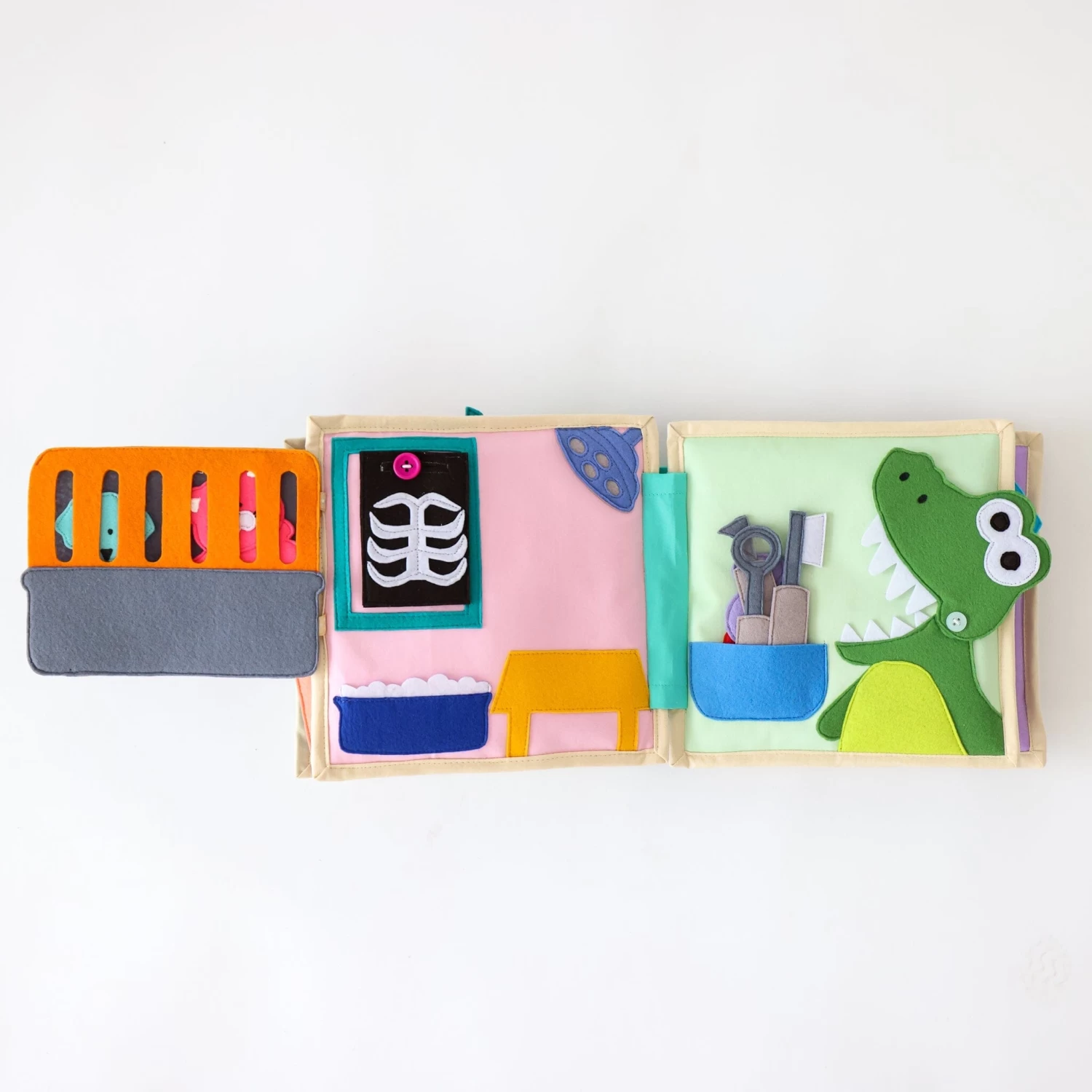Introducing our Medical Adventure quiet book – a captivating and interactive playset designed to ignite your child’s imagination! This book features a removable medic doll and a full doctor’s kit for endless role-playing fun. With nesting patients adorned with buckles, buttons, and tying elements, your child will develop fine motor skills while caring for their adorable patients. The vet section includes an X-Ray machine, crate, and removable cat and dog companions. Food puzzles and threadable scrubs add educational value to the book. Order your Medical Adventure quiet book today and let the imaginative medical journey begin!
