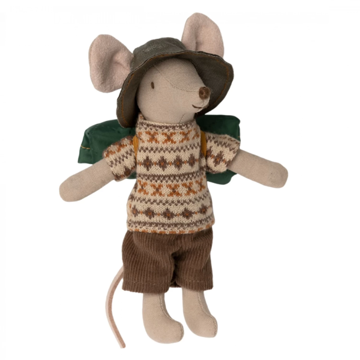 This mouse is well-prepared for a hiking trip in the wild nature. He is dressed for days of walking and brings her sleeping bag for nights under the stars. He has magnets in his hands. Add more accessories from the hiker collection for more play.