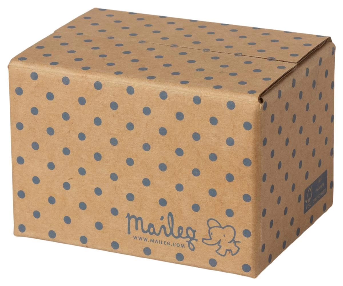 The Maileg miniature grocery box comes with all the food your Maileg friends could possibly need. From tasty mayo, fresh milk, honey in a jar, savory sausage 4 ice cream sticks, egg carton, 2 soda cans, and cheese all delivered beautifully in a cardboard box.