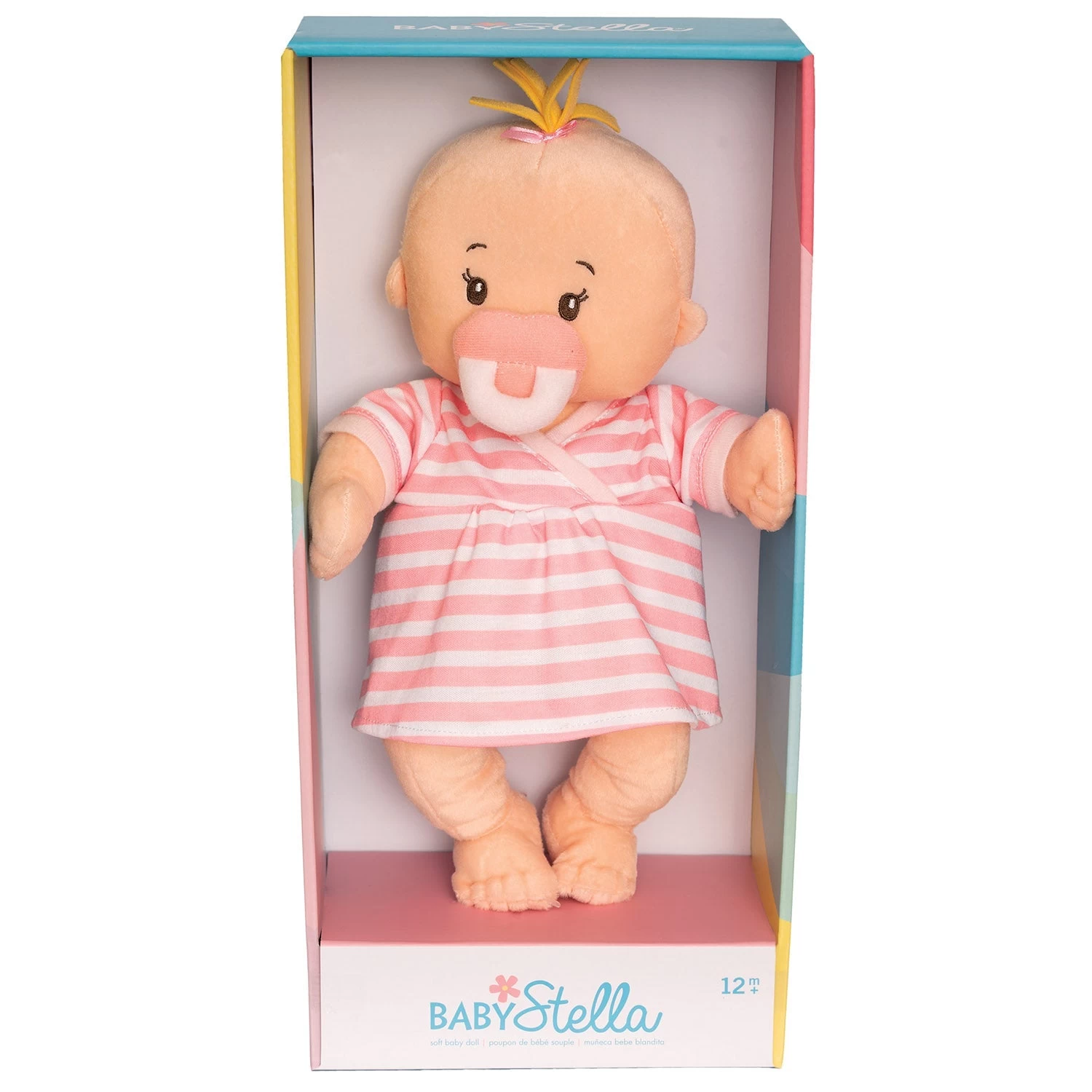 The Baby Stella collection will bring delight to little ones with a new look they are sure to love! Baby Stella is an award winning doll collection that is a perfect, first soft doll to inspire creative role play in little ones. Baby Stella dolls have lifelike toes, belly buttons and plump tummies, embroidered features removable outfit, diaper and magnetic pacifier. Winner of The Bump Best of Baby