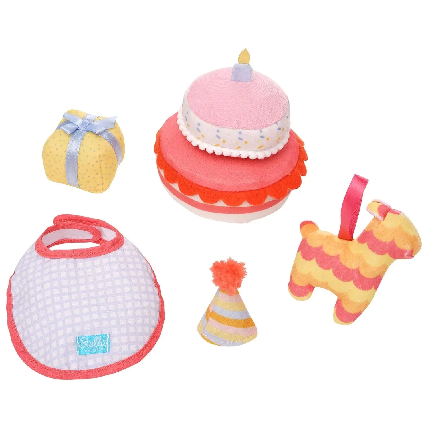 Time to party with the Stella Collection Birthday Party set! This playful six-piece accessory set includes all the makings for a fun-filled birthday celebration: two-layered soft toy cake that separates into two pieces (top and bottom), a fabric bib that adjusts to fit both Baby Stella and Wee Baby Stella dolls, a soft toy gift with ribbon, felt-like fabric party hat with pom-pom and elastic strap, soft toy llama with ribbon loop and a sturdy birthday card that says Happy Birthday! The perfect playset for Baby Stella and Wee Baby Stella fans alike, as all play accessories are compatible with both 15 inch and 12 inch soft dolls. Doll play encourages motor skill development, nurturing role-play, and language skills as littles enjoy talking to their babies.