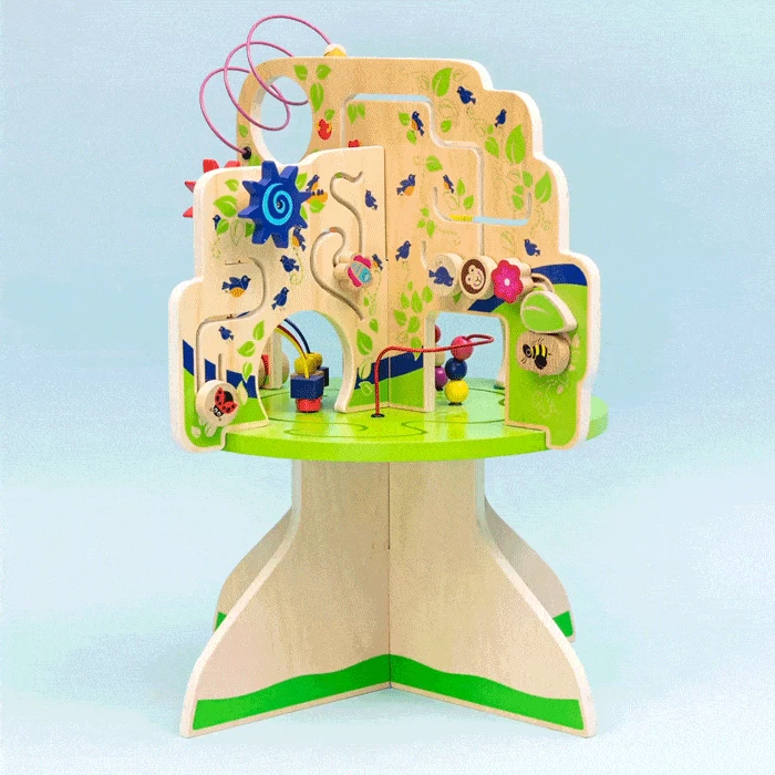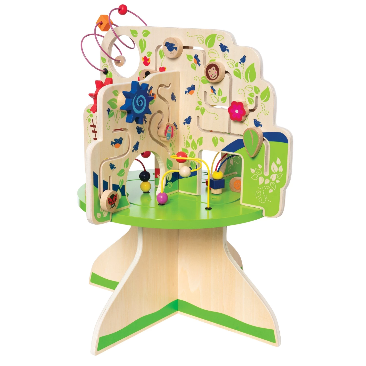 This wood activity center is packed full of exciting features! Includes 4 quadrants in the shape of a tree with a variety of activities for baby : 6 tracks with animal-themed gliders, spinners, colorful bead runs and clacking bead abacus. The Tree Top Adventure offers seated and kneeling play for young toddlers. Although hefty in construction, it is not designed to provide standing or pull-up support. Standing play is only recommended for children able to stand unassisted. As seen on ABC’s The View – best of the Toy Fair feature! Chosen as one of the best toys of the year by Parents Magazine. Scholastic Parent & Child Gold Star toys Award winner.