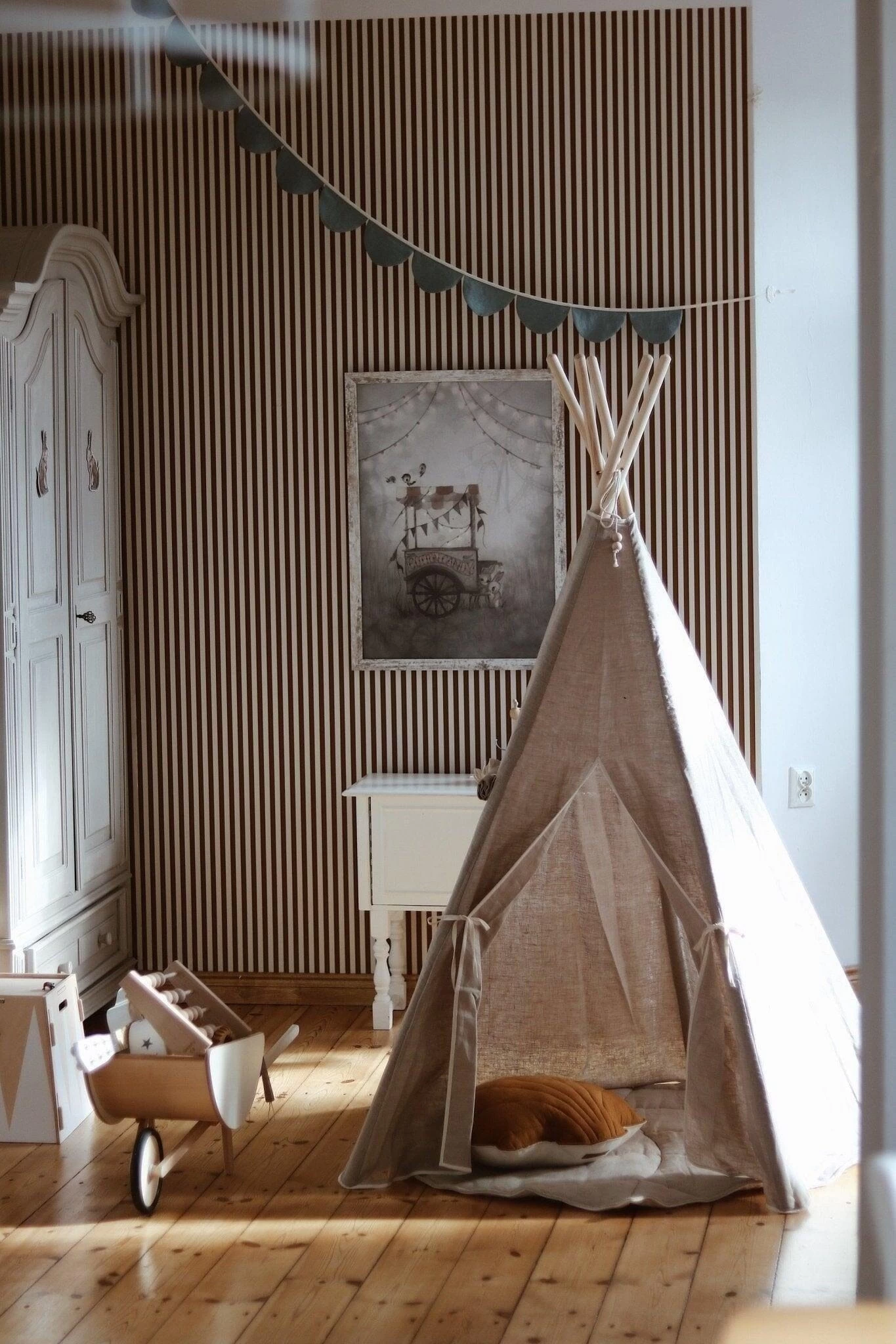 The “Natural Linen” Teepee Tent is firmly sewn from thick linen fabric. Made with an organic linen color and trimmed with a beige border, it matches well with simple natural-colored interiors.