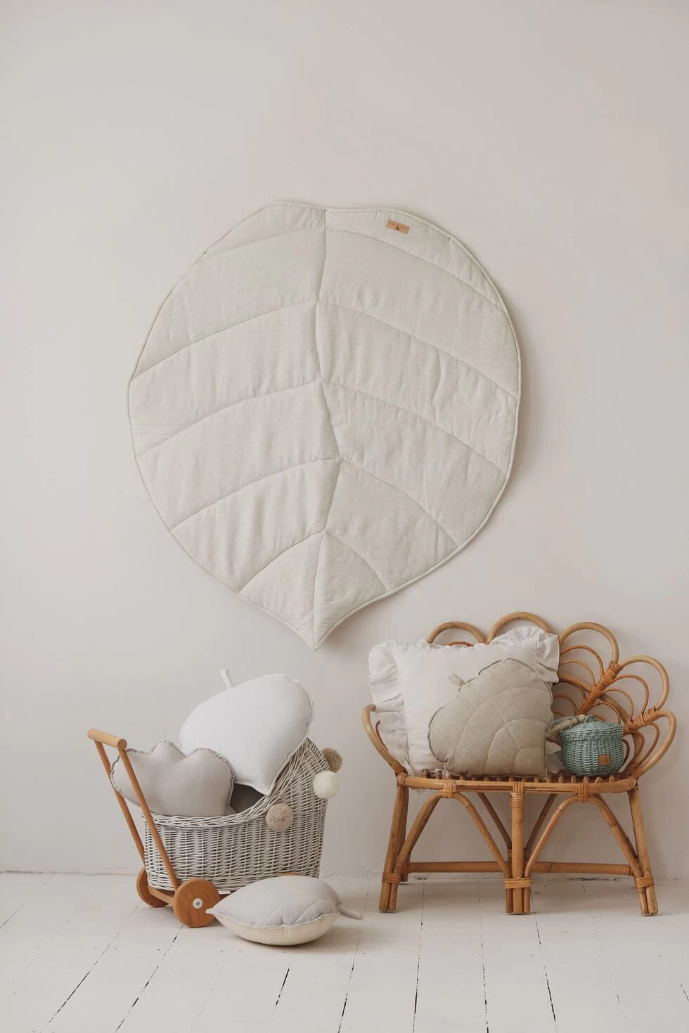 Our fluffy, soft cotton and linen leaf-shaped mat comes in its natural linen color. Durable and double-sided, it is filled with a thick insulation