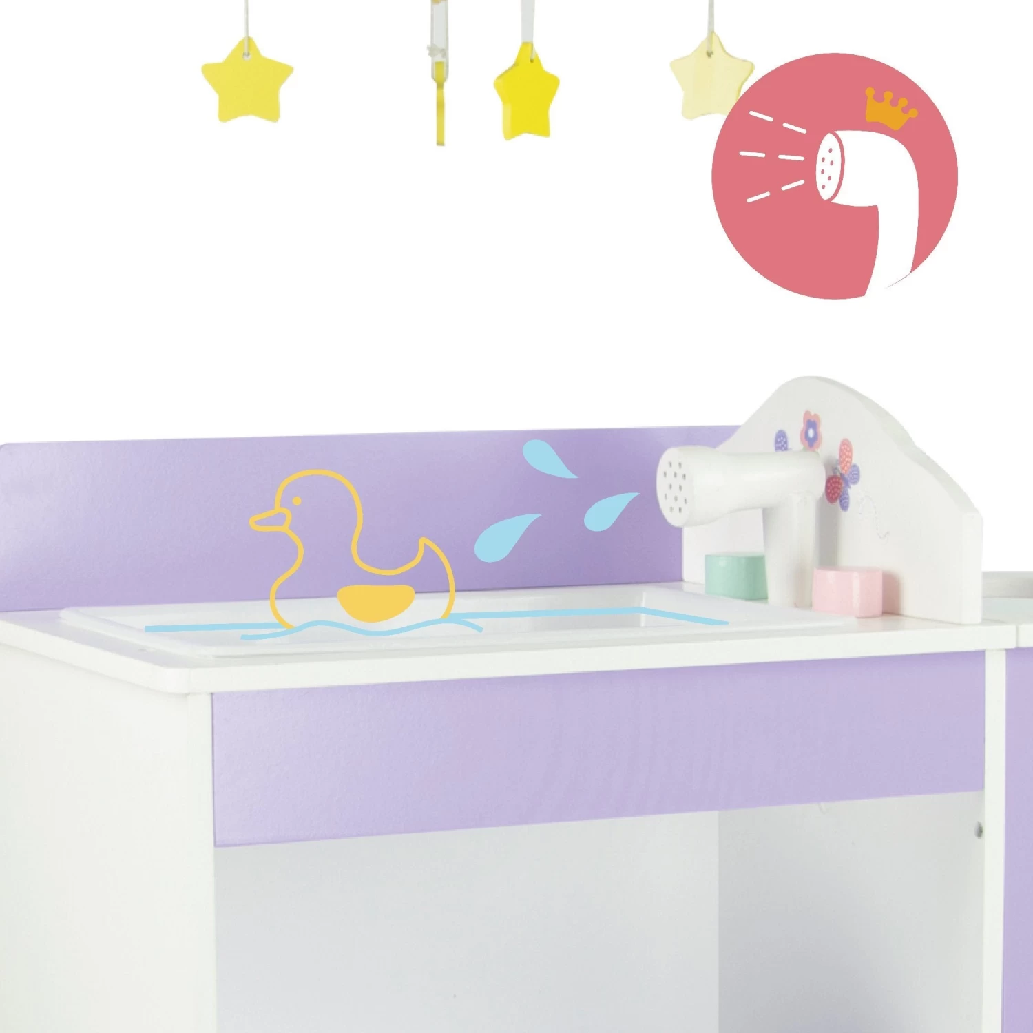 This baby doll changing station is the perfect setup for your child to get their dolls changed and cleaned with no mess and no fuss! For a more realistic experience, the changing station features a complete nursery including a changing area, sink, high chair, and an overhead mobile. Also included are versatile storage options including shelving under the sink and high chair, and a spacious clothing compartment with 3 included hangers under the changing area for spare clothes, diapers, wipes, and any other necessities.