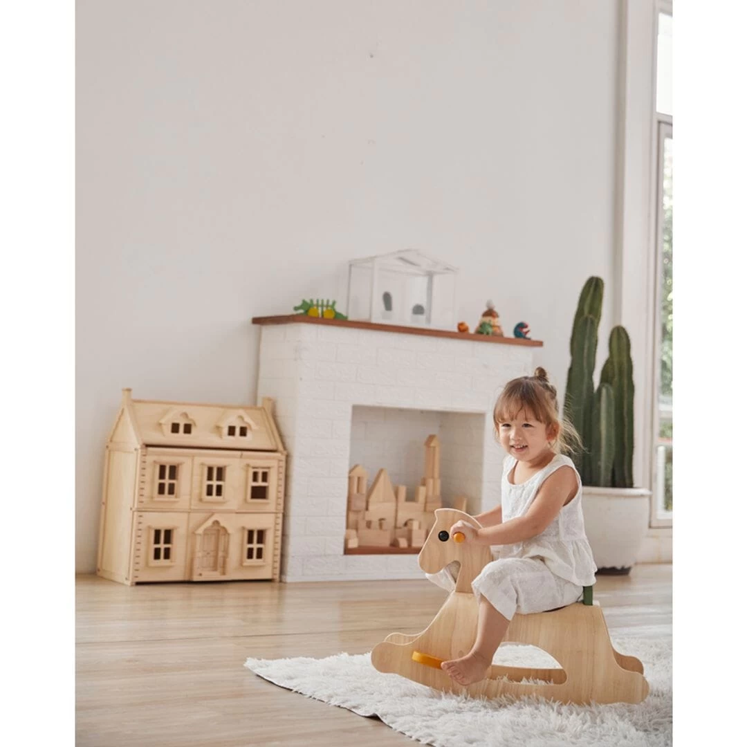 The PlanToys Palomino rocking horse is now available in the modern rustic colorway. It comes with a saddle and is built on parallel rockers so children can rock back and forth. – Built on parallel rockers for easy rocking back and forth – Safety stops are built in to prevent child from rocking to far forward or backward. – Comes with a built-in saddle and colorful accent