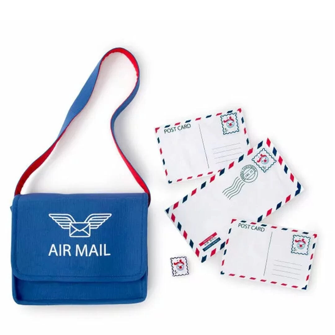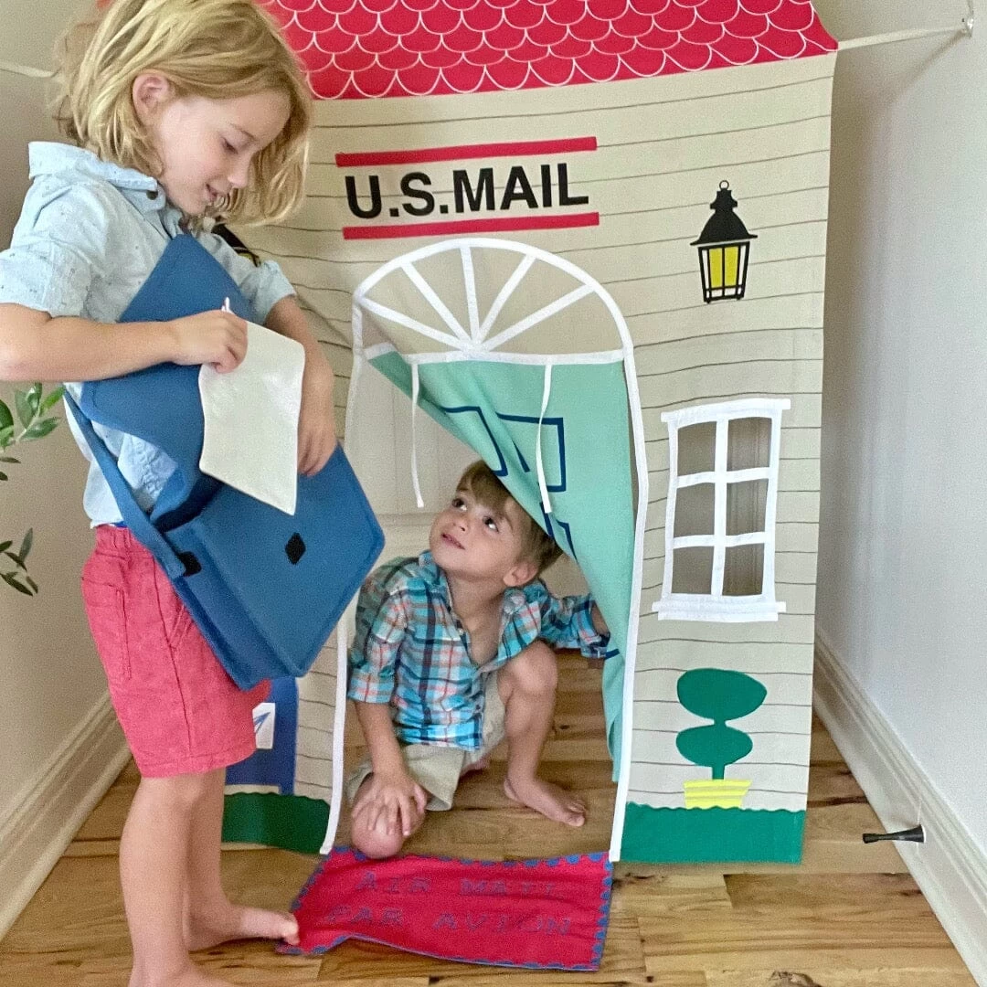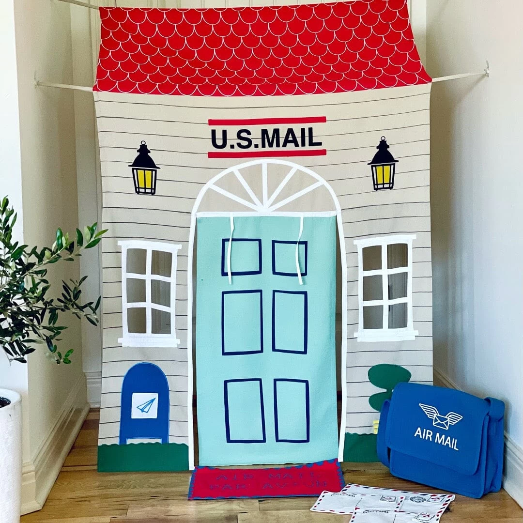 Letters, packages, magazines, and papers all need a mail carrier to bring them home. Supported by a doorway and your child’s imagination, this wonderfully colored tent temporarily* transforms any space in the house into a post office. Are they ready to deliver some letters? The child-size mail bag and its contents will assist your mail carrier-in-training as they make their deliveries. Your postal worker can receive letters to deliver through a mailbox in any indoor location. *Yes, temporarily. The quick-to-assemble doorway play tent can be taken down with ease when using your favorite damage-free hanging adhesive hooks. The Post Office Set is hand sewn and silk-screened. The set comprises One unit doorway play tent size and One unit of mailbag. Mail Bag Includes: two textile envelopes, two textile postcards, and four textile postage stamps.