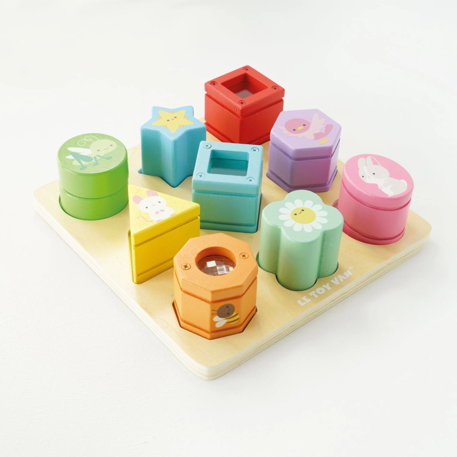 This adorable sensory shapes sorter is sure to become a playtime favourite with it’s sweet, appealing design and pretty colourway.