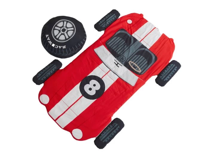 Be off to the races…the slumber races, that is…in our Race Car Sleeping Bag. Comfy poly fill sleeping bag with amazing embroidered details, a chunky zipper that’s easy to zip and unzip, and a super puffy spare tire pillow will have them speeding to bed.