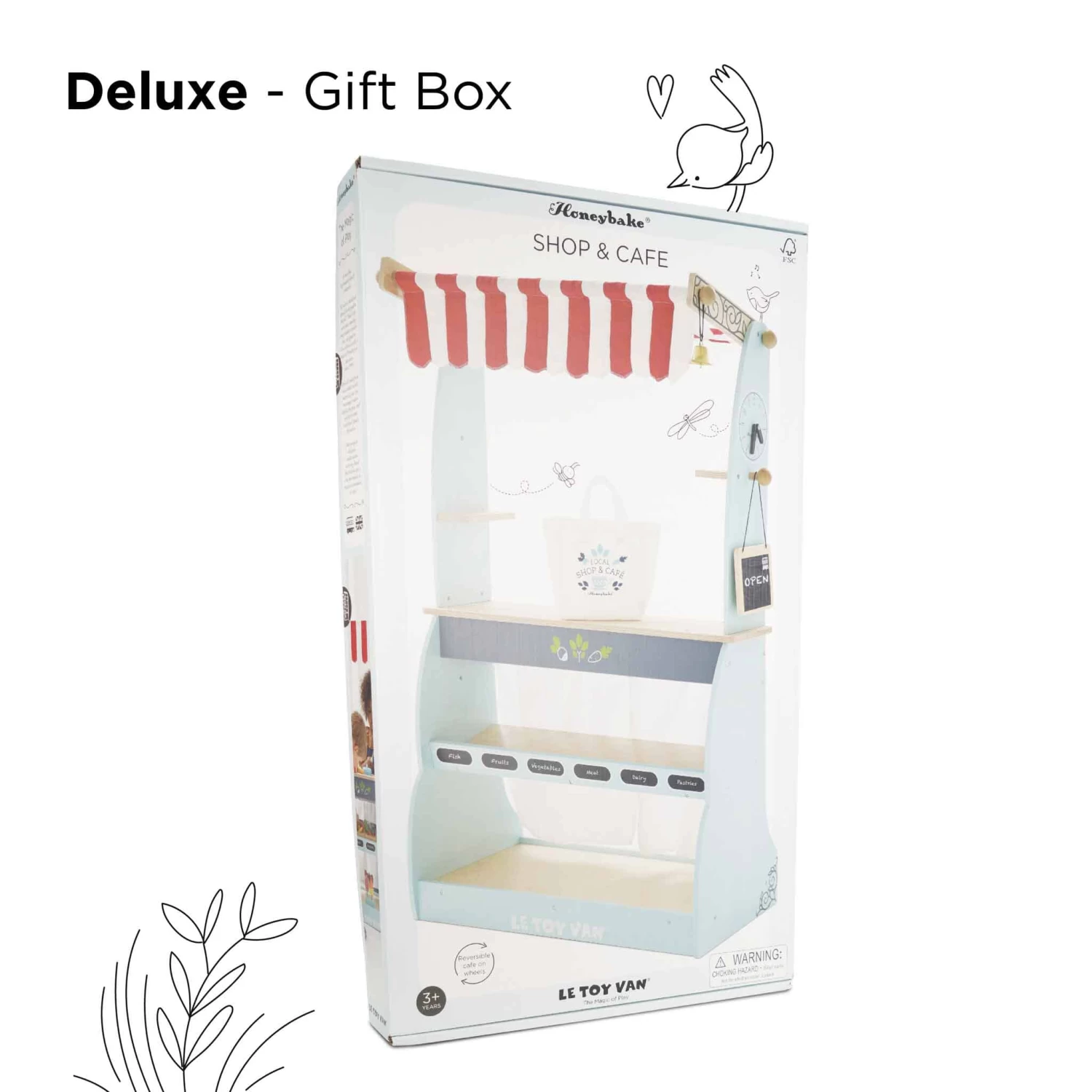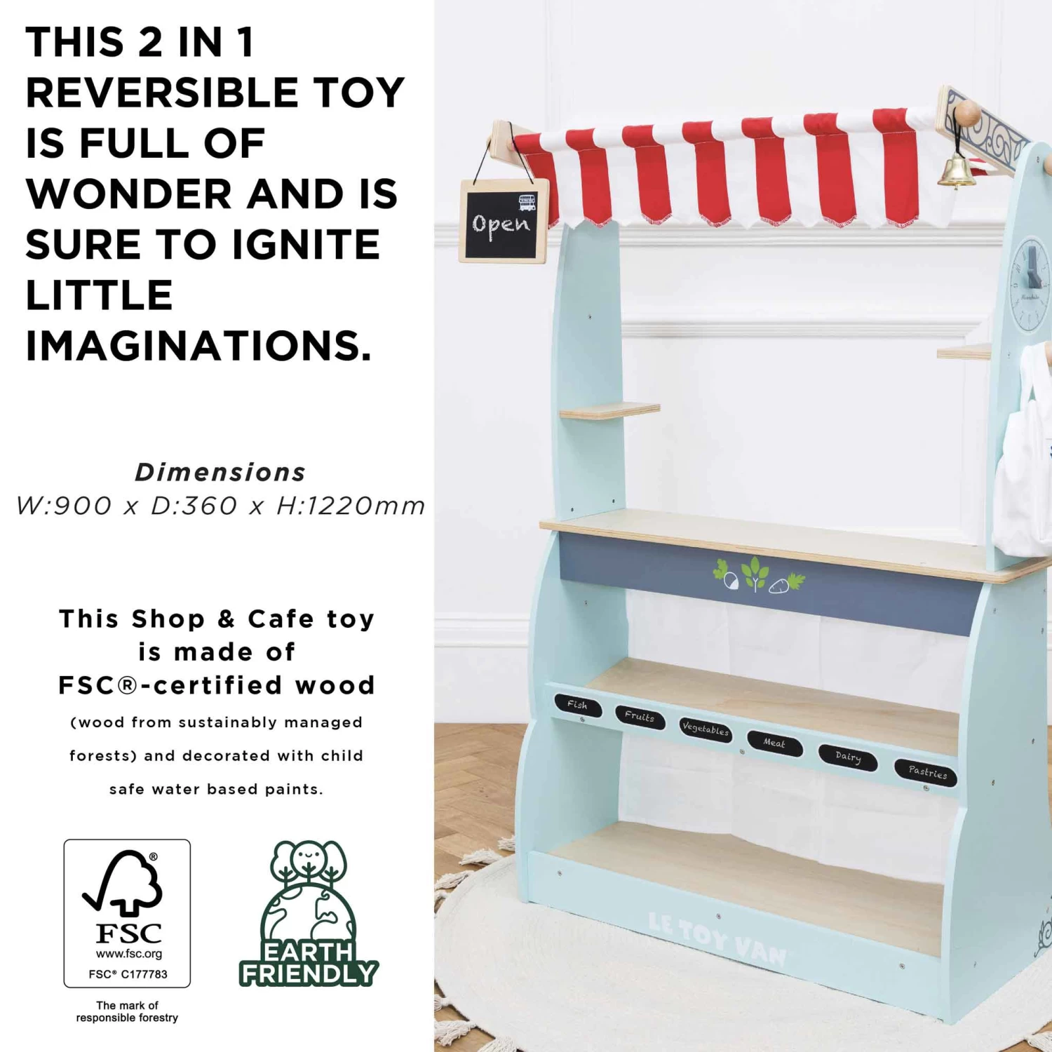Little ones will adore serving customers at the café, then simply turn it around to reveal a market style shop complete with shelves, ideal for housing our wooden food crates.Â