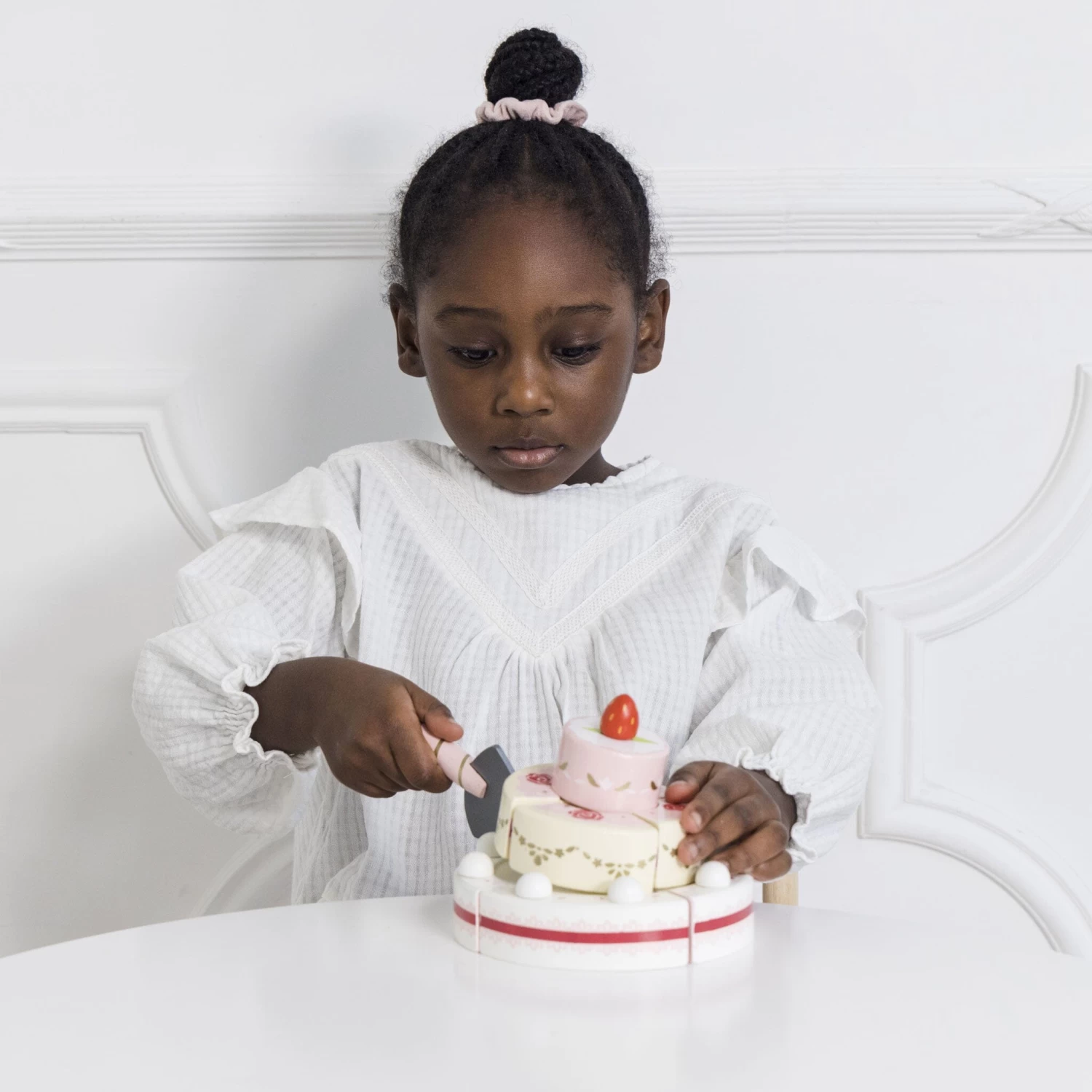 The lower and mid tier sections come in 4 detachable sections (with velcro fastenings), for added realistic play plus a cake slice for serving guests. Swathes of golden paint and a strawberry on the top adds the perfect finishing touch to this decadent treat.