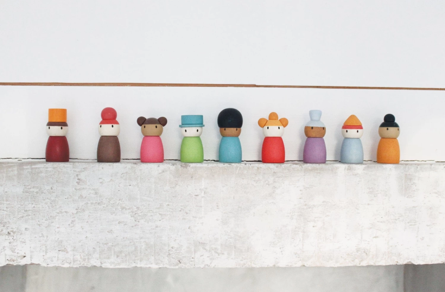 Part of our open-ended play, meet the 9 folks who reside at the happy hotel. Made from solid wood, colored with a soft water based stain, they can represent anyone you know. These little people are perfect for adding to any sort of creative or imaginative play, and can be perched easily on any surface.