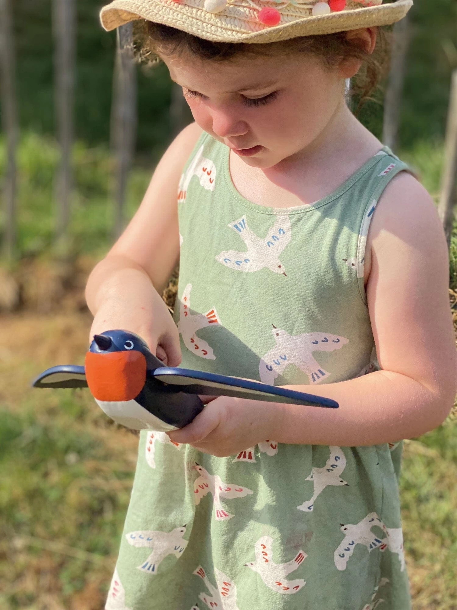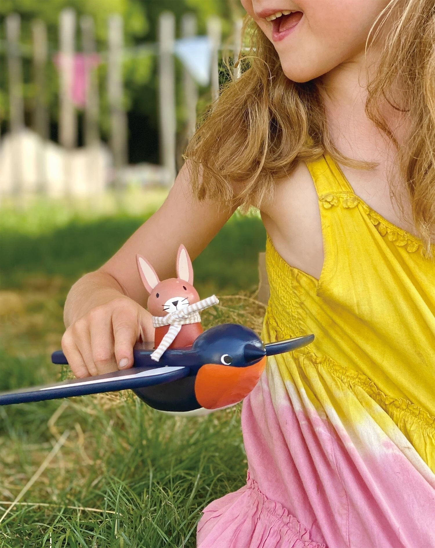 Flying high above our Merrywood village is Spud the pilot Hare, carried by his best friend Swifty the Swallow. The little Hare is removable and has a fabric scarf and his name written underneath.