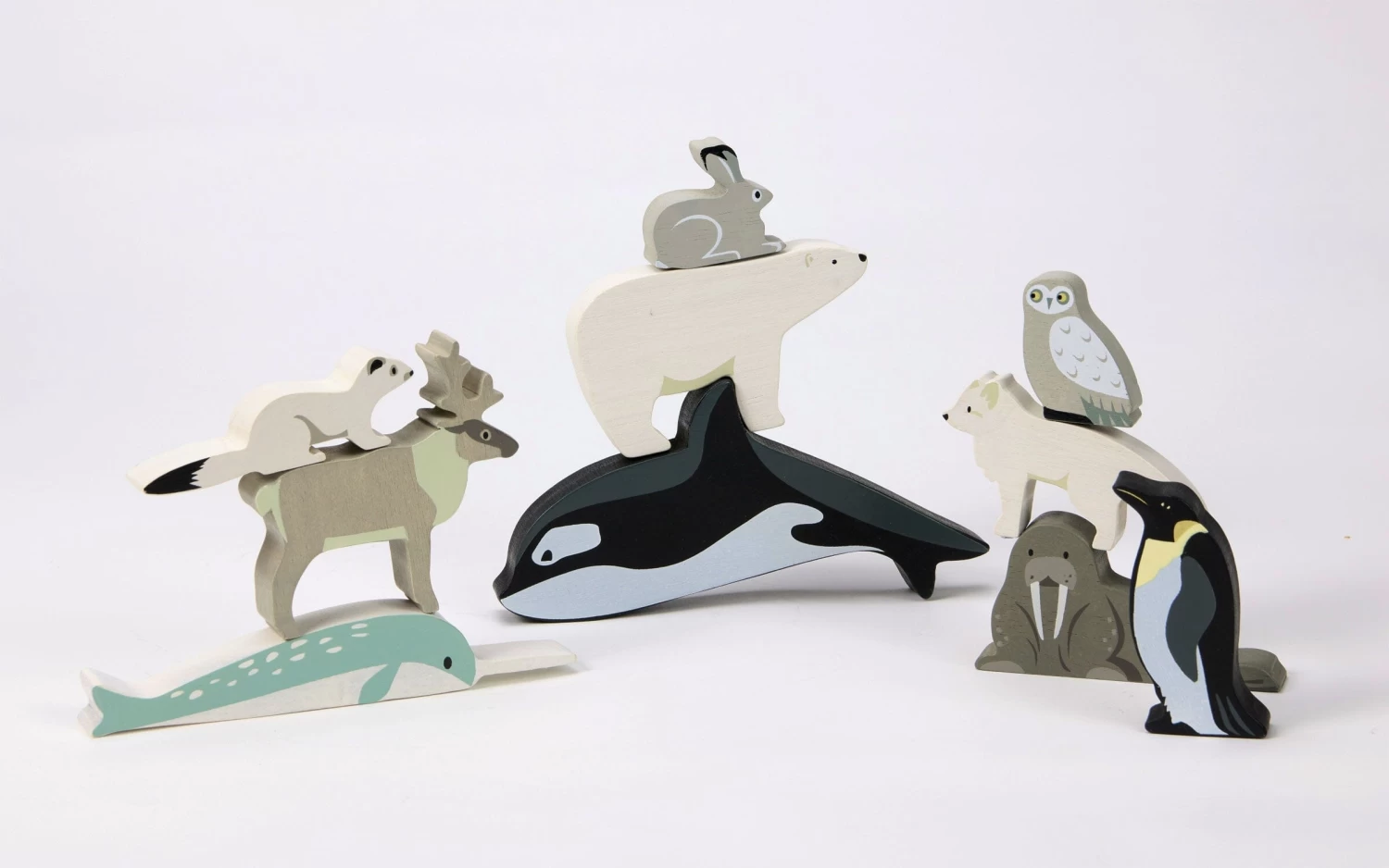 Our endangered animals from the two frozen poles. Presented in a shelving unit, solid wood animals – orca, narwhal, snow hare, arctic fox, king penguin, owl, white stoat, walrus, an elk and of course a polar bear.