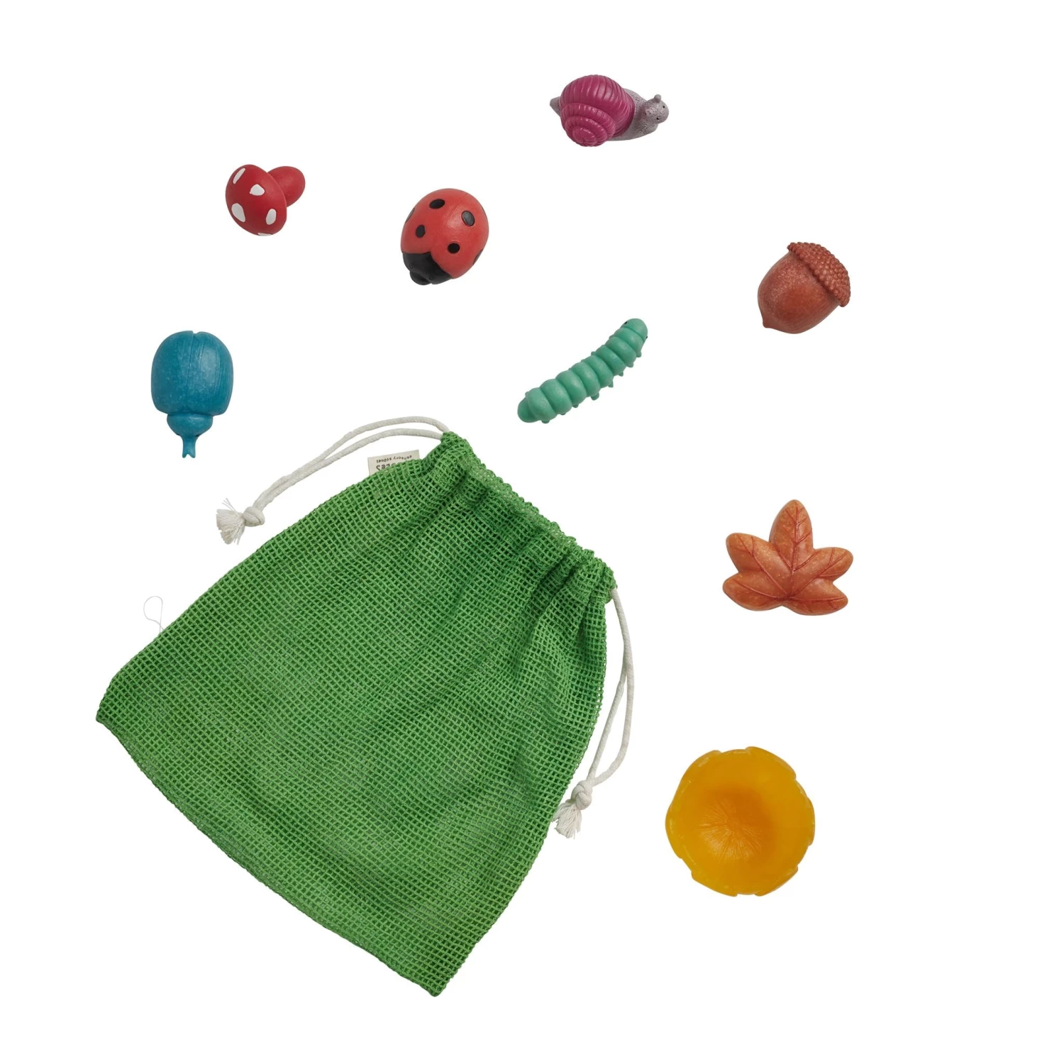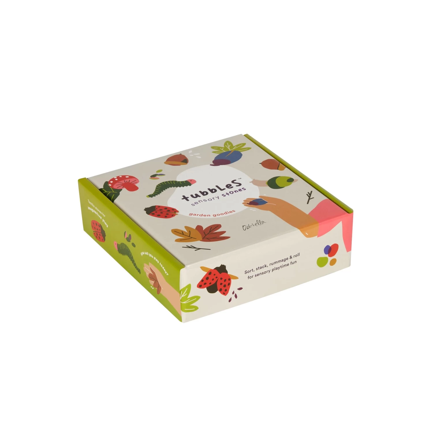 Each Set comes packed in a gift-ready box and includes seven sensory stones, a small matching bowl, and a mesh bag to keep the set together, and for easy cleaning. Inside the Garden Goodies box, you will find one caterpillar, ladybug, leaf, beetle, snail, acorn, and toadstool.Â