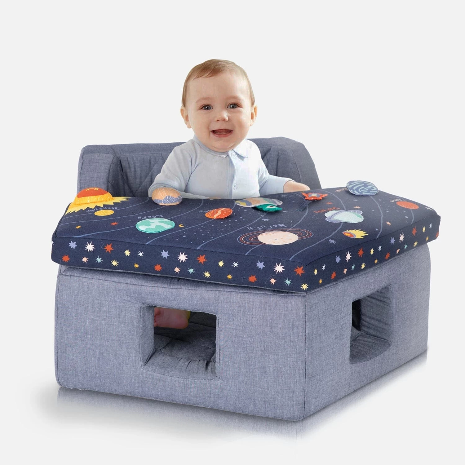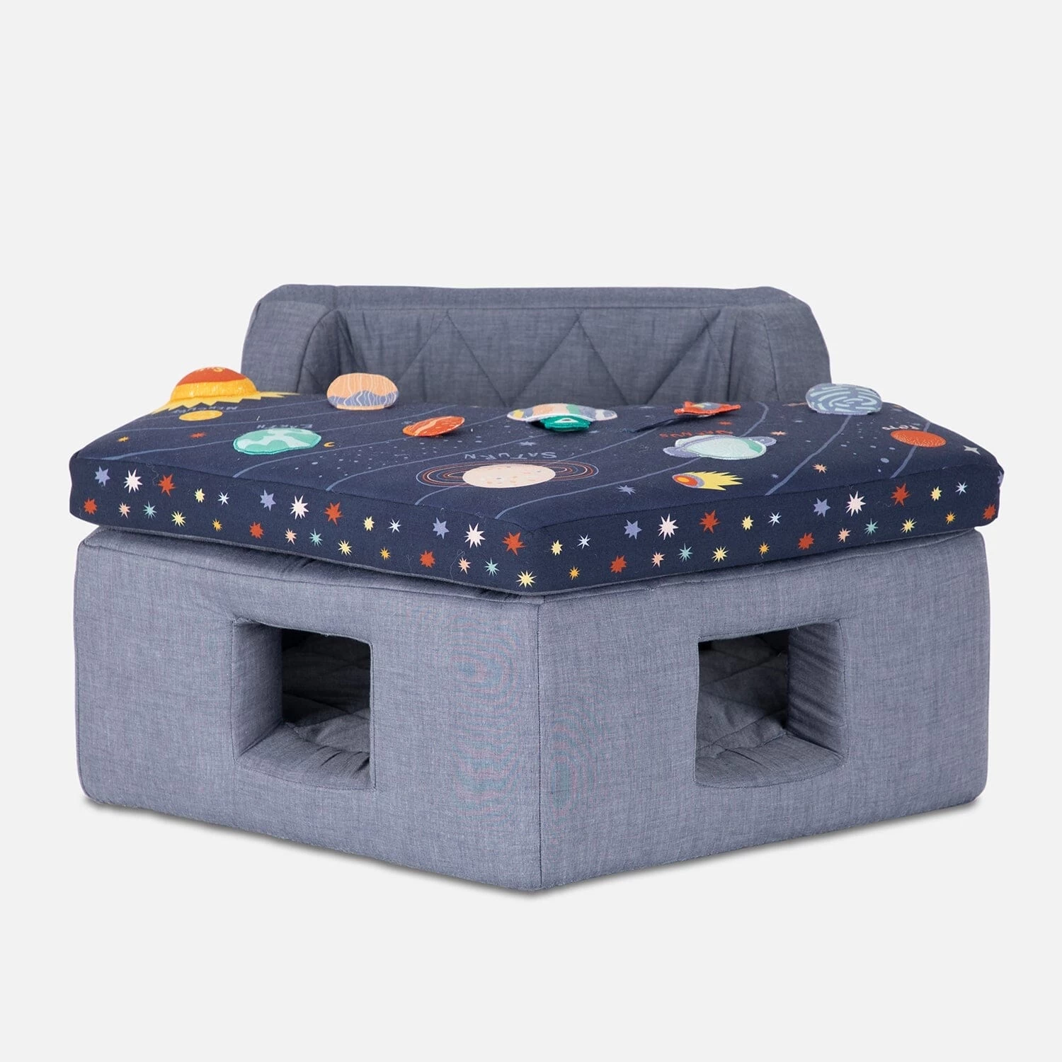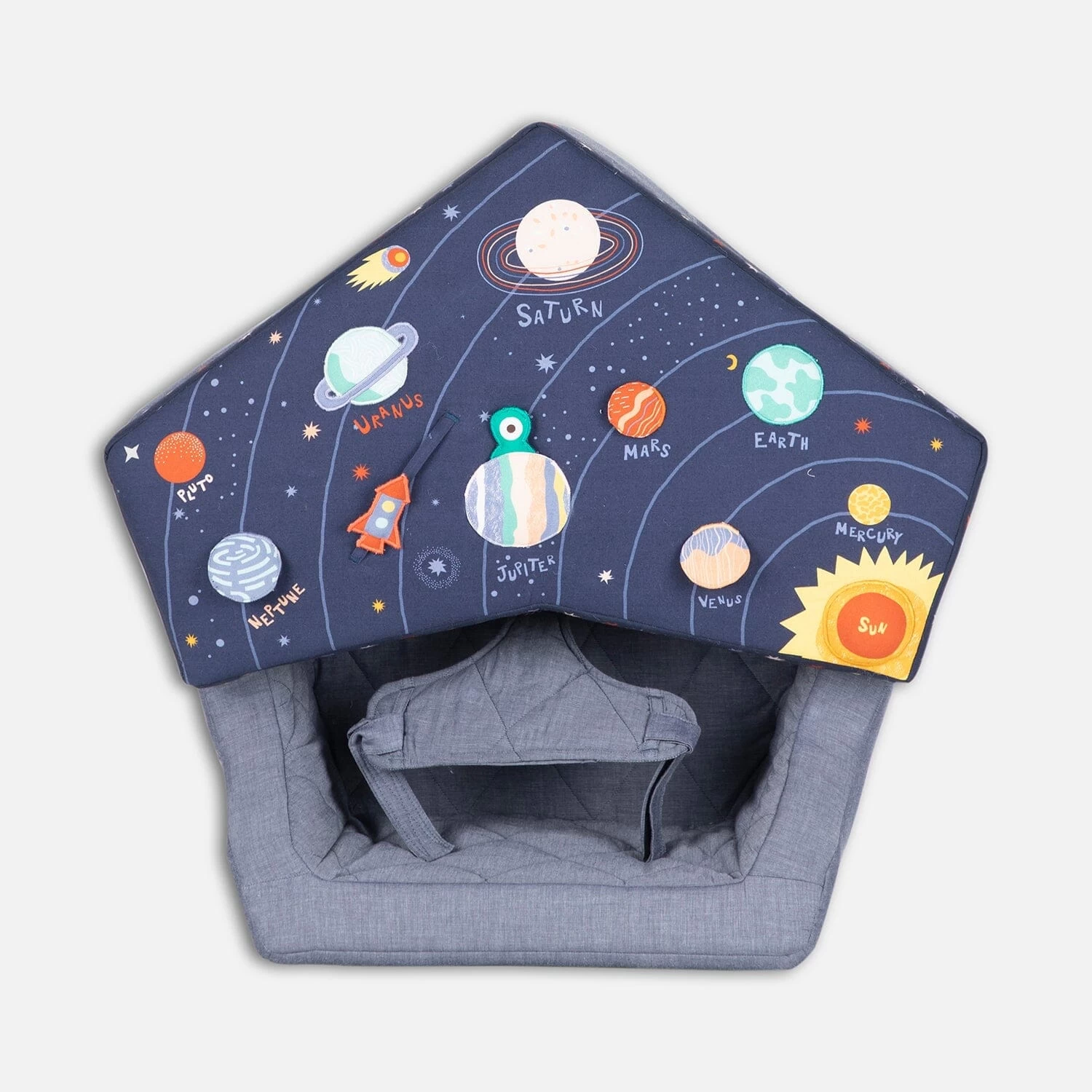 Conduct an interplanetary mission of the imagination with the Under the Star Baby Activity Center. This comfy seat features a removable tray with plenty to keep little astronauts occupied: a mirror, rattle, and squeakers. Hand-embroidered and crafted for safety, the chair should only be used on the floor and never unattended. Secure the waist harness and tray in place for secure space explorations, all under your supervision. Get ready for blastoff – the Activity Center is suitable for ages 3-9 months. Materials include 100% cotton percale and 100% polyester fill with 100% polyurethane foam covering. Spot clean only. Made in India.